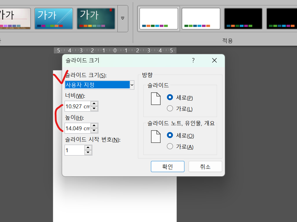 슬라이드 크기를 사용자 지정으로 선택하고